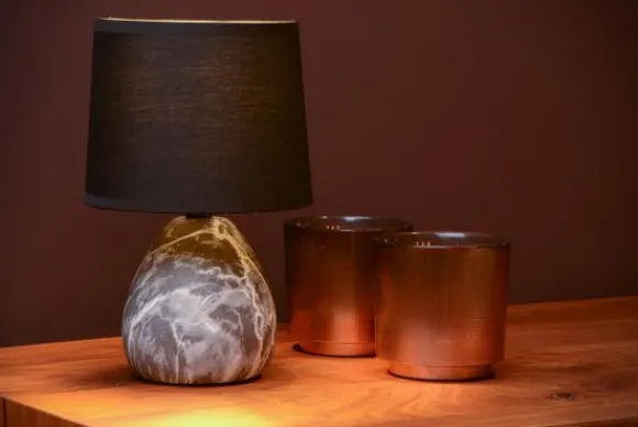 Tafellamp Marmo van het merk Lucide is tijdloos en elegant. Met een marmeren look geef je je interieur meteen dat extra stijlvolle tintje. Met deze keramische tafellamp krijg je hetzelfde effect. De linnen kap vangt het licht en creëert een speelse schijn op de donkere nerven van de poot.