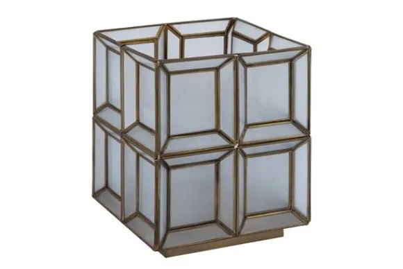 Tafellamp Layra van het merk PTMD is een handgemaakt designstuk dat luxe en karakter uitstraalt. De geometrische glasvlakken, omlijst met antiekkleurig metaal, zorgen voor een stijlvol lijnenspel en een verfijnd spel van licht en reflectie.
