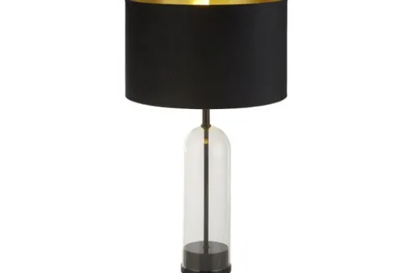 Tafellamp Oxford EU81710BK van het merk Searchlight is een luxueuze lamp met een zwart voetstuk van marmer dat in een glazen stolp zit. De lampenkap is van zwart velvet, de binnenkant is goud gekleurd voor een elegant effect.