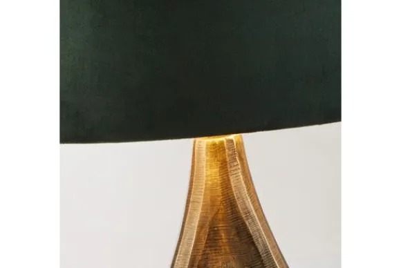 Tafellamp EU86531GR Bucklow van het merk Searchlight heeft een voetstuk gemaakt van brass. De lampenkap is gemaakt van donkergroen velvet.