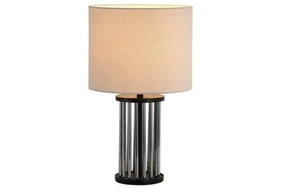 Tafellamp Swizzle EU55623SM van het merk Searchlight is een stijlvolle lamp met een moderne, luxueuze uitstraling. De combinatie van zwart metaal, glazen accenten en een linnen kap geeft deze lamp een chique karakter dat in elk interieur tot zijn recht komt.