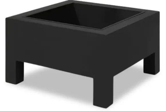 De vierkante vorm met hoge, rechte poten zorgt voor een stoer silhouet dat moeiteloos aansluit bij een industrieel buiteninterieur.