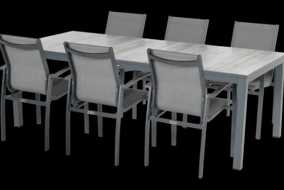 De tuinstoel is stapelbaar en wordt geleverd in de kleur antraciet.
