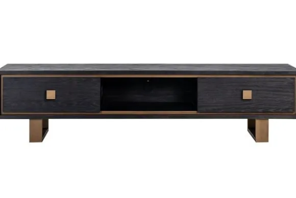 Tv-meubel Hunter 210477 van het merk Richmond Interiors is een kast die een en al moderne luxe uitstraalt! De kast is namelijk gemaakt van zwart gebeitst eiken met details van roestvrij staal die een antiek gouden kleur hebben. De kast heeft twee grote lades en een open vak, genoeg ruimte om al je spullen op te bergen! Het meubel is eenvoudig te onderhouden, als er een vlek op komt kan je deze eenvoudig wegdeppen met keukenpapier of een doek met wat water.