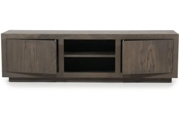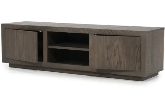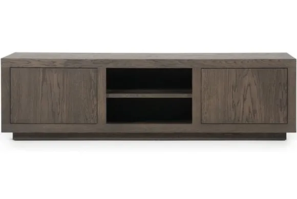 Het tv-meubel heeft twee open vakken in het midden en twee deuren aan de zijkanten. Deze indeling biedt ruimte voor media apparatuur en zorgt voor opbergruimte uit het zicht. Het tv-meubel maakt deel uit van een met bijpassende meubels.