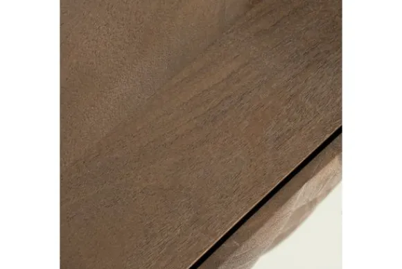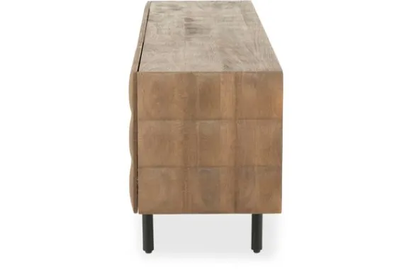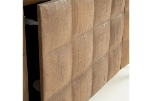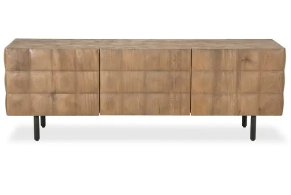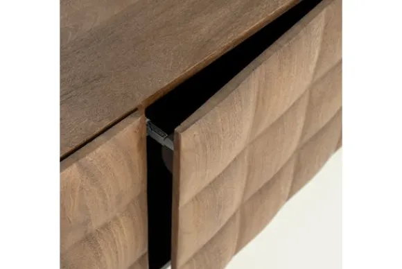 Tv-meubel Felix 96369 van het merk Eleonora is een stijlvol samenspel van ambacht en eigentijds design. Het warme mangohout is uitgevoerd in een natuurlijke bruine tint die de rijke houtnerf prachtig tot zijn recht laat komen. Wat meteen opvalt, is het verfijnde reliëfpatroon op de frontpanelen. Een kubistisch spel van diepte en schaduw dat elke lade een bijna sculpturale uitstraling geeft. Alsof licht en textuur met elkaar in dialoog gaan. De strakke, zwarte poten van gepoedercoat ijzer tillen het geheel letterlijk naar een hoger niveau en zorgen voor een luchtige, moderne touch.