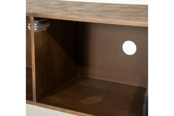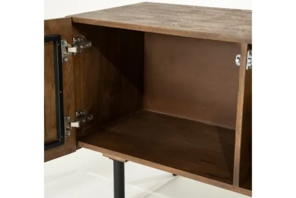 Het contrast tussen het warme hout en het industriële onderstel creëert een perfecte balans tussen robuust en elegant. Dit tijdloze meubelstuk biedt niet alleen visuele kracht, maar ook praktische opbergruimte voor elektronica, accessoires en meer. Ideaal voor een strak georganiseerde en sfeervolle woonkamer.