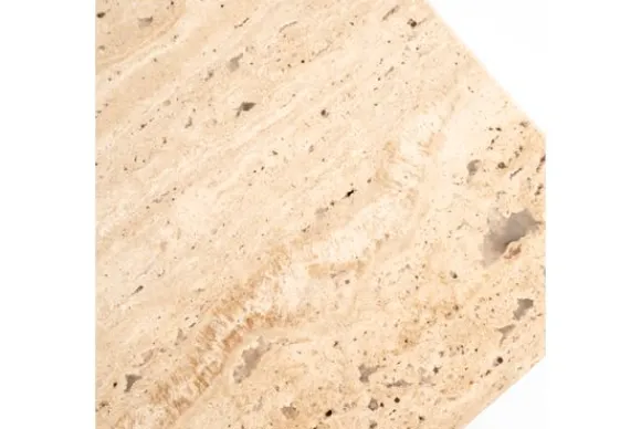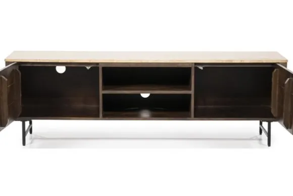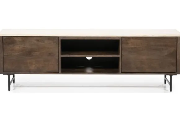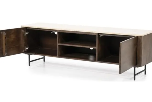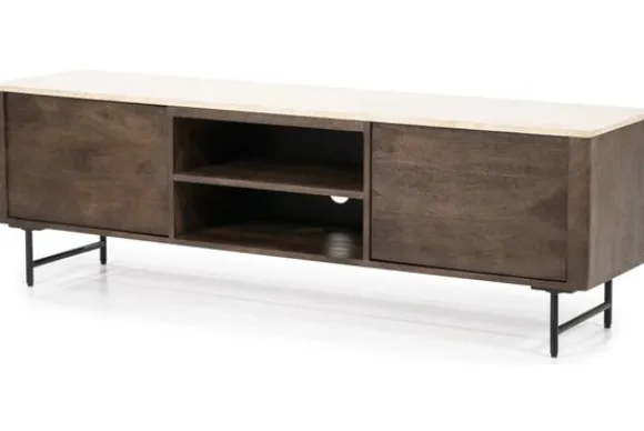 Het tv-meubel is gemaakt van mangohout. Dit hout heeft zichtbare kleurschakeringen en natuurlijke verschillen in het oppervlak. Mangohout is stevig en geschikt voor dagelijks gebruik. Het blad boven de deuren is uitgevoerd in travertin. Dit is een natuursteen in een lichte beige tint met kleine open structuren. Travertin is sterk en eenvoudig schoon te maken met een licht vochtige doek.