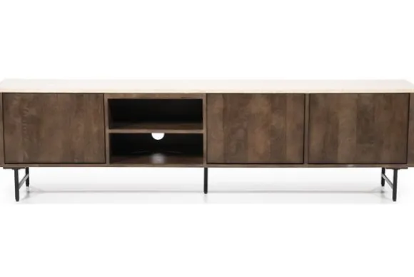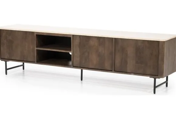 Het tv-meubel is gemaakt van mangohout. Dit hout heeft zichtbare kleurschakeringen en natuurlijke verschillen in het oppervlak. Mangohout is stevig en geschikt voor dagelijks gebruik. Het blad boven de deuren is uitgevoerd in travertin. Dit is een natuursteen in een lichte beige tint met kleine open structuren. Travertin is sterk en eenvoudig schoon te maken met een licht vochtige doek.