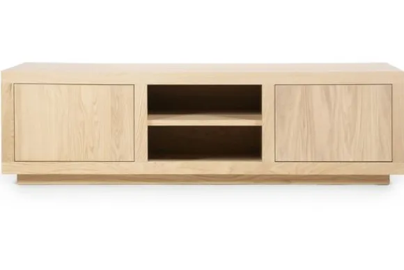 Het tv-meubel heeft twee open vakken in het midden en twee deuren aan de zijkanten. Deze indeling biedt ruimte voor apparatuur en zorgt voor extra opbergruimte uit het zicht. Het tv-meubel maakt deel uit van een met bijpassende meubels.