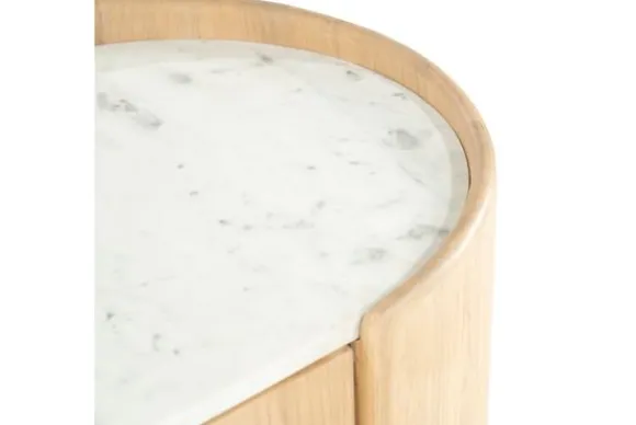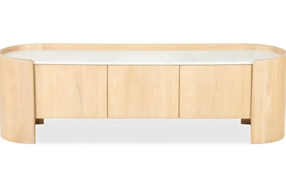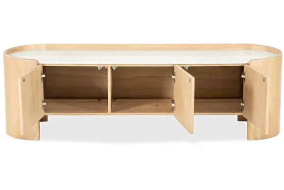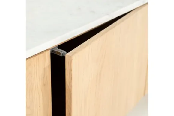Het witte marmeren blad vormt een stijlvol contrast met het lichte hout en reflecteert subtiel het licht, alsof er een zweem van rust over het meubel ligt. De greeploze deuren zorgen voor een strak silhouet en verbergen praktische opbergruimte voor apparatuur, kabels of woonaccessoires.