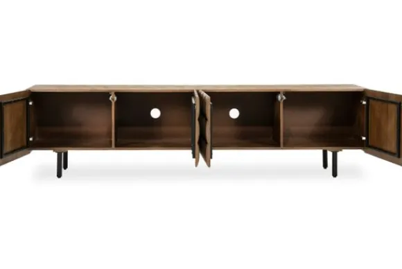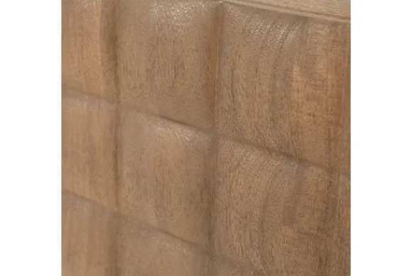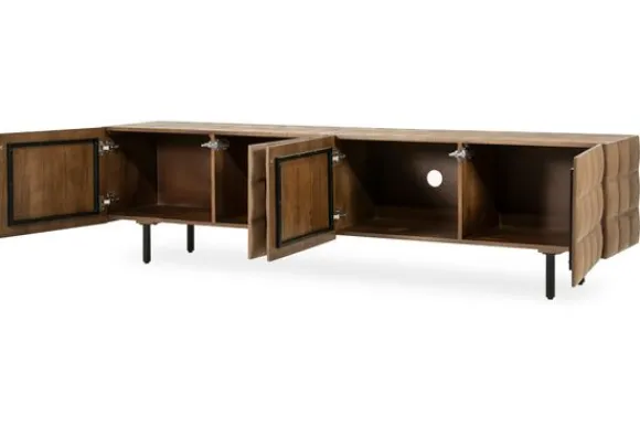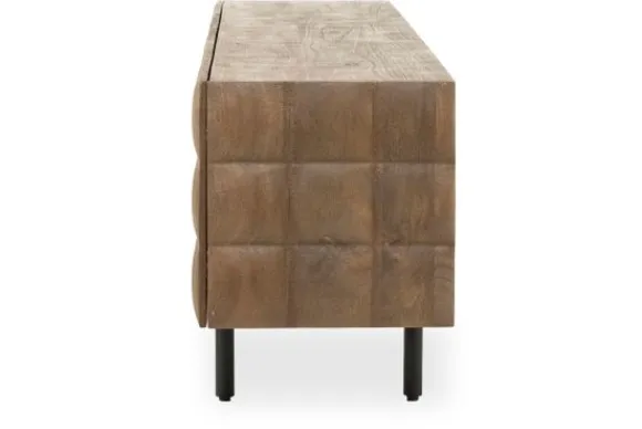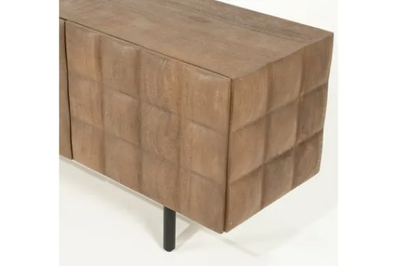 Tv-meubel Felix 96370 van het merk Eleonora is een modern meesterwerk in mangohout en ijzer dat elegantie en karakter moeiteloos combineert. Het oppervlak is bekleed met een geometrisch reliëf, waarbij het warme mangohout een subtiel spel van licht en schaduw laat zien. Elk vierkant blok op het front lijkt met zorg uit het hout gesneden, waardoor het meubel een bijna architectonisch ritme krijgt. De natuurlijke bruine houttint benadrukt de levendige nerven en warme ondertonen van het mangohout, wat zorgt voor een authentieke, aardse uitstraling. Het slanke, zwarte onderstel van gepoedercoat ijzer voegt een hedendaags contrast toe en tilt het ontwerp naar een hoger esthetisch niveau. Met zijn royale afmetingen biedt dit dressoir volop opbergruimte, terwijl het tegelijkertijd een stijlvol statement maakt in de woonkamer, eetruimte of hal.