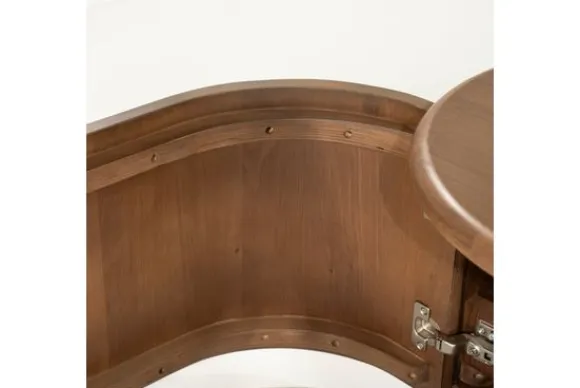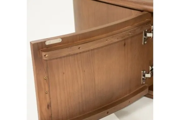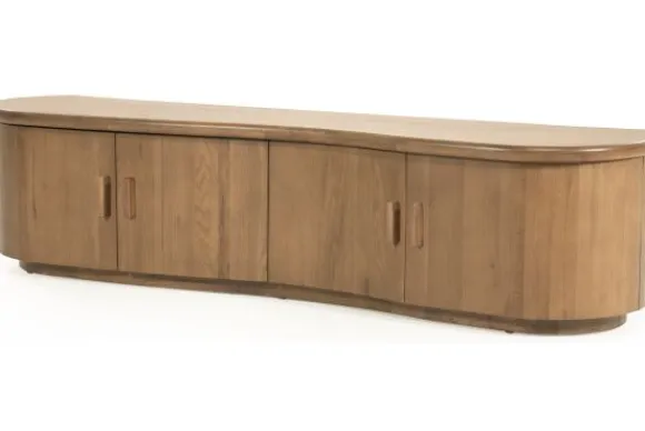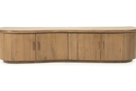 De volledig ronde afwerking van de hoeken en het blad zorgt voor een vriendelijk en zacht uiterlijk. Deze vormgeving maakt het tv-meubel prettig om naar te kijken en gemakkelijk te plaatsen in verschillende woonruimtes. Het geheel oogt rustig en evenwichtig zonder te overheersen.