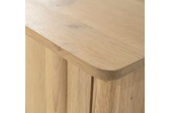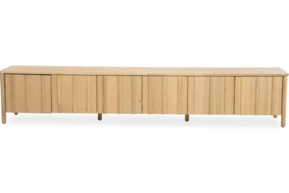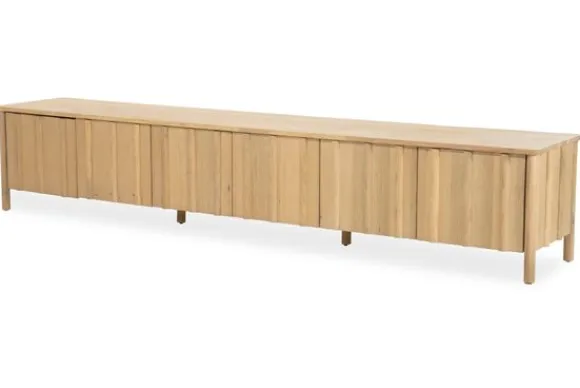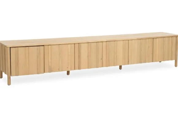 Het tv-meubel is gemaakt van massief eikenhout en eiken fineer. De naturel afwerking laat de houtnerf en kleurnuances goed zichtbaar. De zes deuren zijn uitgevoerd met een lamelpatroon dat zorgt voor een strak en gelijkmatig lijnenspel. Afgeronde hoeken en slanke poten geven het meubel een verzorgde en luchtige opbouw.