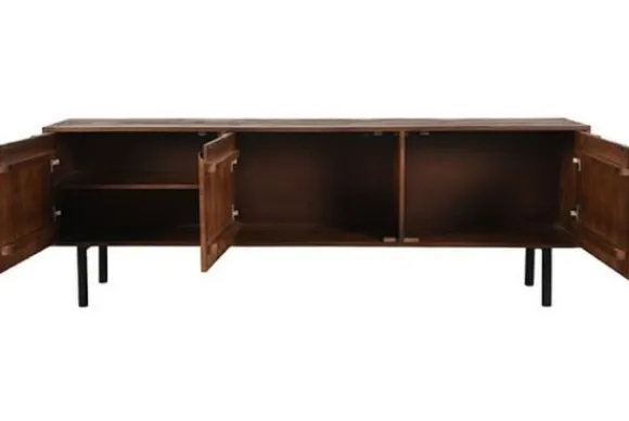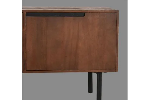 Deze fris ogende kast, uitgevoerd in de kleur espresso en voorzien van een licht gezandstraald oppervlak, is gemaakt van mangohout. Tv-Meubel Rio is voorzien van 3 deuren met hier achter ruime opbergvakken. Achter het meest rechter deurtje, is de ruimte opgedeeld in twee vakken, om ook kleine tv-accessoires efficiënt op te bergen. Rio heeft rond uitgefreesde handgrepen die een prachtig onderdeel van de kast zijn. Rio heeft 4 zwarte metalen poten, waarvan de zijpoten zijn voorzien van een verbindingsframe. Het frame zorgt voor een bijzondere sterkte en extra stabiliteit.