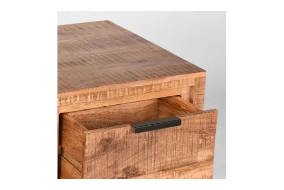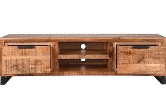 Tv-meubel Glasgow RF-37.120 van het merk Label51 is met zijn ruwe mango houten oppervlaktes, gecombineerd met zwart metalen sledepoten een stoer en industrieel meubel.Tv-meubel Glasgow, uitgevoerd in de kleur rough is gemaakt van ruw, duurzaam mangohout. Glasgow heeft een bijzondere, individuele uitstraling door de unieke draad van het hout.