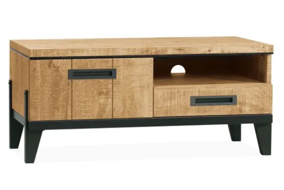 Tv-meubel Lucania – Union van het merk Lamulux is uitgevoerd in de kleur Mango en heeft een stoere uitstraling. De combinatie van hout met metalen poten en handgrepen geeft het meubel een robuust karakter. Het tv-meubel is praktisch ingedeeld met één deur met verticale planken, een open vak en een lade.