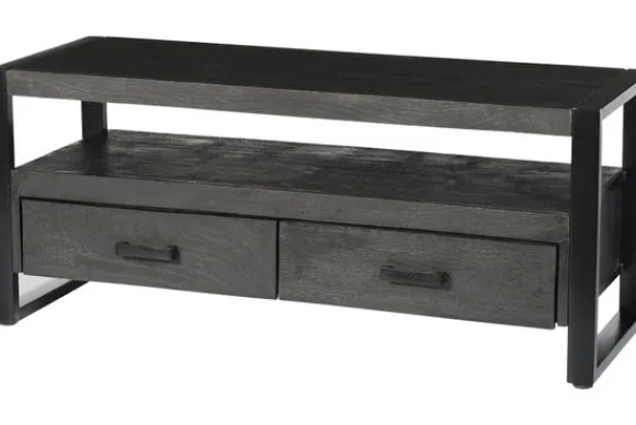 Het tv meubel is voorzien van twee lades voor het opbergen van spullen. Daarboven bevindt zich één groot open vak, geschikt voor media apparatuur of decoratie.