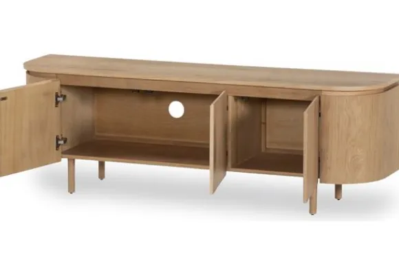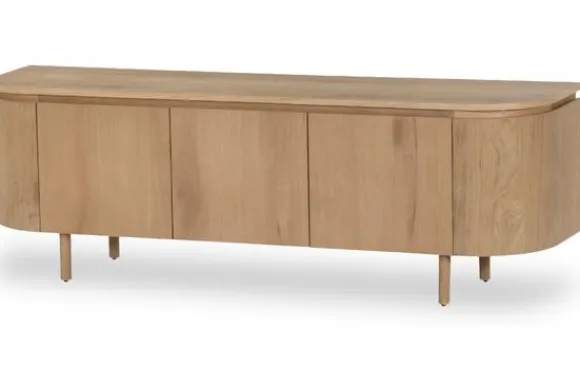 TV-meubel Tobago van het merk Livingfurn brengt een gevoel van lichtheid en natuurlijke rust in de woonkamer. Het naturel MDF-fineer benadrukt de zachte houtstructuur en geeft het meubel een frisse, organische uitstraling. De afgeronde hoeken en greeploze deuren zorgen voor een vloeiende, minimalistische vormgeving die rust uitstraalt zonder aan elegantie in te boeten.