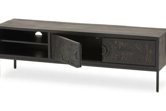 Tv-meubel Carving CRV.TV.0005 van het merk MySons straalt elegantie en vakmanschap uit en is een absolute blikvanger in elke woonkamer. Het meubel is vervaardigd van massief mangohout in de prachtige kleur Black Antique, die een warme en tegelijkertijd stoere uitstraling geeft. Mangohout kun je herkennen aan de vele kleurschakeringen en ongelijkheden in het oppervlakte van het hout, waardoor geen enkel meubelstuk hetzelfde is. De kleuren in mangohout kunnen variëren van licht- tot donkerbruine tonen, met soms een rode gloed of juist een gelige ondertoon. Mangohout is een duurzaam houtsoort.