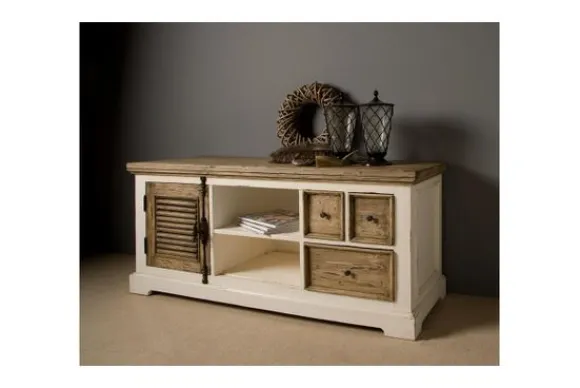 Tv-meubel Amanda TD 0017 van het merk Tower Living is gemaakt van hergebruikt grenen. Het geleefde hout geeft deze kast een romantische en landelijke uitstraling. Je kunt dit hout makkelijk schoonmaken met een zachte vochtige doek. Deze kast heeft diverse opbergmogelijkheden, namelijk twee open vakken, drie lades en één deur.