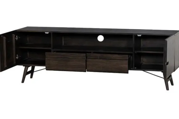Met twee deuren aan de zijkant, twee ruime lades in het midden en een open vak biedt dit meubel voldoende plek voor media-apparatuur en accessoires. Het kabeldoorvoergat aan de achterzijde zorgt ervoor dat snoeren eenvoudig en netjes weggewerkt kunnen worden.