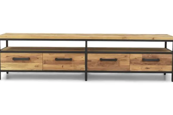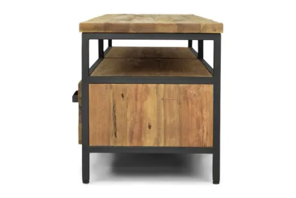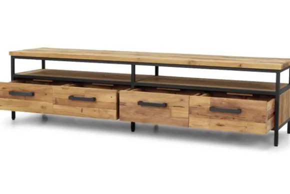 Tv-meubel Livorno FI 0105 van het merk Tower Living is gemaakt van gerecycled teakhout gecombineerd met metaal. Door de matte afwerking en dit gebruik van materialen heeft het meubel een industriële uitstraling. De tv-kast heeft vier lades en één open vak.