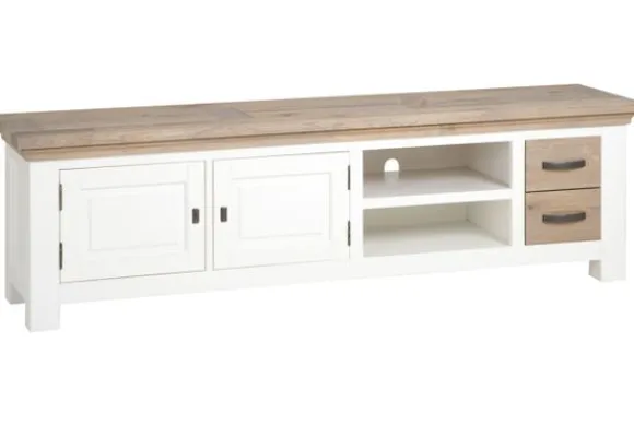 Tv-meubel Parma MC 0113 van het merk Tower Living wordt geleverd in de kleur wit. De eiken delen worden licht geborsteld en afgewerkt met een olie. Je kunt dit hout makkelijk schoonmaken met een zachte vochtige doek. Deze kast heeft diverse opbergmogelijkheden, namelijk twee lades, twee open vakken en twee deuren.