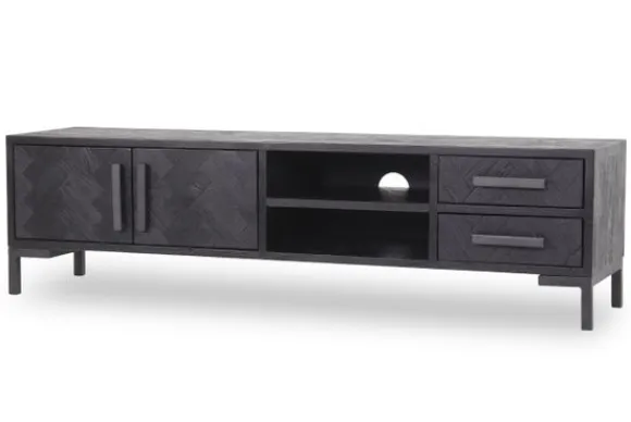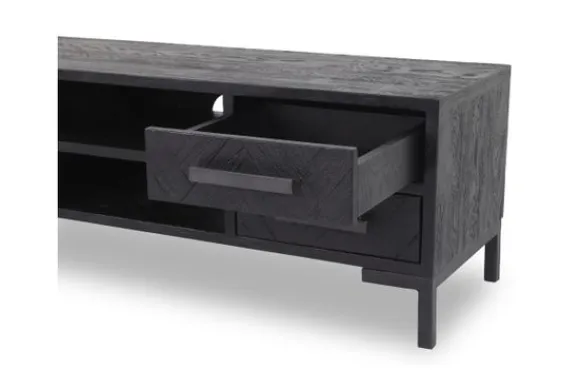 Tv-meubel Ziano NA 0182 van het merk Tower Living is helemaal trendy, met zijn stoere design, zwarte kleur en visgraat fronten. De fronten zijn gemaakt van prachtig gerecycled hout. De meubelen worden gezandstraald, wat ervoor zorgt dat de nerven in het oude hout extra geaccentueerd worden. De lades zijn voorzien van softclose geleiders. Ziano heeft een luxe en chique uitstraling, maar past ook perfect in een industriële inrichting. Deze kast is voorzien van twee deuren, twee open vakken en twee lades, je kunt de lades en deuren openen met een smalle metalen handgreep.