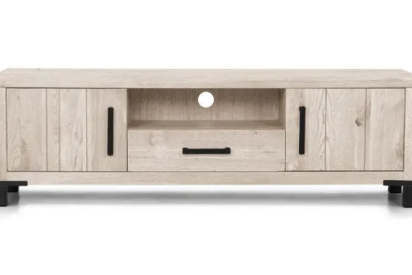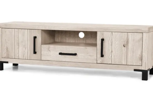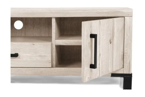 Tv-dressoir Odile van het merk van Dijk Furniture is verkrijgbaar in verschillende kleuren. Het meubel is gemaakt van massief eiken, waardoor het een robuuste kast is die lang mee zal gaan! De handvaten en poten zijn gemaakt van zwart metaal, dit geeft de kast een moderne uitstraling. Dit tv-meubel heeft één open vak, twee deurtjes en één lade.