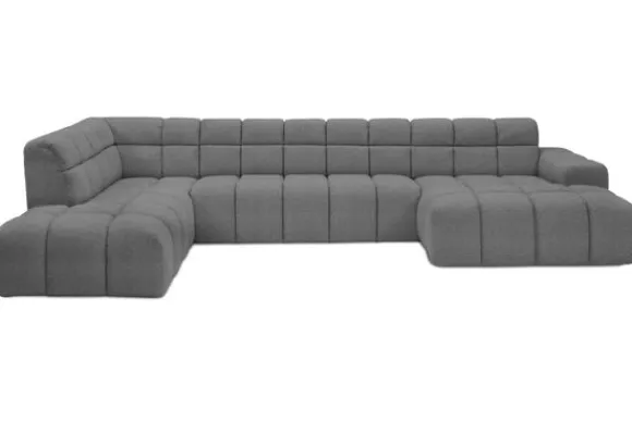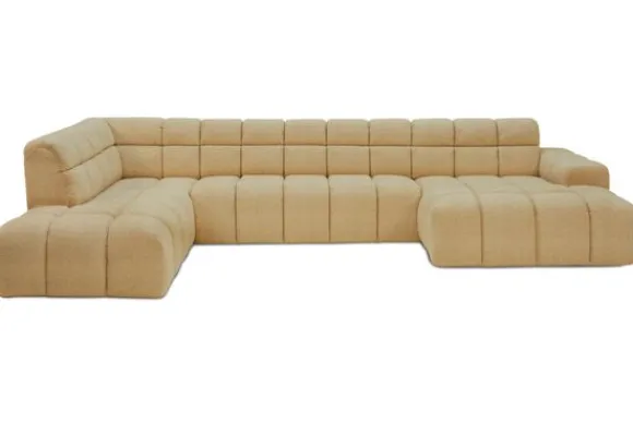 Bankstel Treviso van het merk Moderno is een bank met geblokte zit- en rugkussens en een zitting die doorloopt tot net boven de grond.