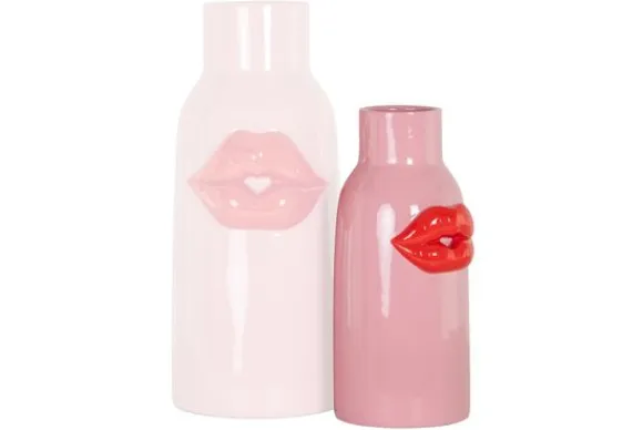 Vaas Blythe 213461 van het merk Richmond Interiors is een speels en opvallend decorstuk met een knipoog naar pop-art. De roze vaas is versierd met rode lippen in reliëf en trekt direct de aandacht.