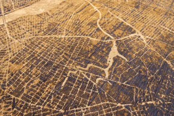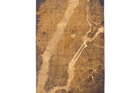 Vloerkleed Cities New York Gatsby Gold 9315 van het merk Louis de Poortere toont een indrukwekkend luchtbeeld van New York in een warm gouden kleurpalet. Het ontwerp vangt de energie van de stad, waarbij fijne lijnen en patronen doen denken aan de dynamiek van het stratenplan. Door de combinatie van een artistieke cartografische stijl en rijke tinten, straalt het vloerkleed zowel elegantie als karakter uit.