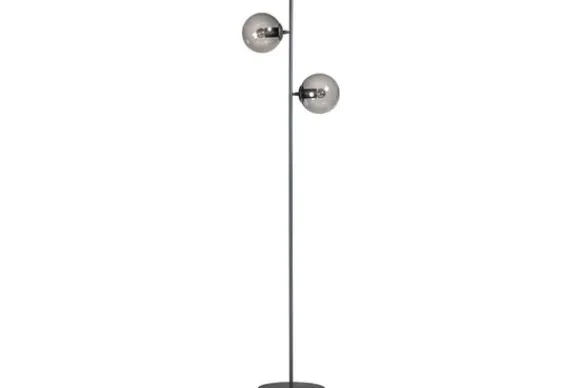 Vloerlamp Davina van het merk ETH is niet alleen mooi wanneer hij brand. Overdag is het ook zeker een plaatje om naar te kijken. Deze lamp heeft ronde glazen lampenkappen die een licht gerookte kleur hebben. Elke bol is 18x18cm.