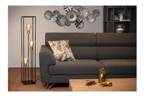 Vloerlamp Ruben van het merk Lucide mag opvallen. En dat doet Ruben, want zo heet dit exemplaar, door de eenvoud van zijn moderne design. Het metalen frame in combinatie met de koperen fitting straalt gezelligheid uit. De geschrankte plaatsing van de drie lichtpunten geven het strakke ontwerp een speelse toets. Met drie lampen en een hoogte van 1,20 meter creëert Ruben voldoende licht. Monteer warme, witte ledlampen en zorg zo voor die sfeervolle gloed in je woonkamer, eetkamer of slaapkamer. Je bedient de staande lamp met de schakelaar op het snoer.