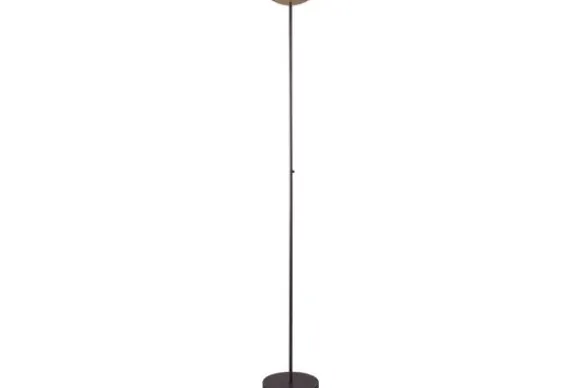 Vloerlamp Scala 1191-81-02 van het merk Masterlight is een strakke en eenvoudige lamp. De rechte vloerlamp staat op een mooie ronde, metalen zwarte vloerplaat met een strak vormgegeven gouden, ronde lampenkap. De moderne vloerlamp is 186 centimeter hoog. In de woonkamer, leeshoek of slaapkamer. De rechte vloerlamp komt goed tot zijn recht in verschillende soorten ruimtes. Bepaal zelf de sfeer door het push-dim systeem wat bij de vloerlamp zit. Zacht licht voor de knusse momenten en wat harder licht als je heerlijk op de bank zit om een boek te lezen. Er zit een lichtbron bij deze lamp.