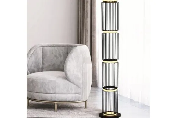Vloerlamp Circolo Cage EU54211-1BK van het merk Searchlight is een strakke, industriële vloerlamp. De lamp bestaat uit vijf LED-ringen, die verbonden zijn door matzwarte staven. Dit creëert een monochrome kleur. De lamp heeft een trendy uitstraling en is gemakkelijk in iedere kamer van een modern interieur te plaatsen. De lamp wordt geleverd inclusief snoer en voetschakelaar.