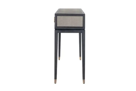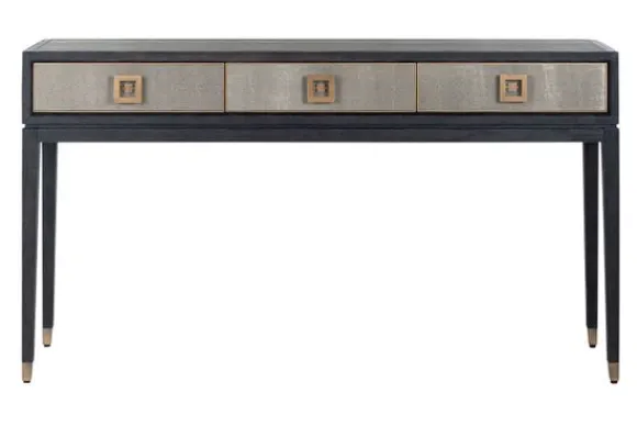 Wandtafel Bloomville 210621 van het merk Richmond Interiors heeft een luxe uitstraling door het shagrene uiterlijk in combinatie met de brasse (staal in matgoud) grepen. De tafel is gemaakt van zwart gebeitst eiken en is bekleed met PU-leer. De tafel heeft drie lades om spullen in op te bergen. Onderhoudstip: Er wordt aangeraden om op het zwarte frame geen schuursponsjes en schoonmaakmiddelen met schuurmiddel te gebruiken, omdat dit krassen kan veroorzaken. Daarnaast kun je de roggehuidprint het beste schoonmaken met een droge of lichtvochtige, pluisvrije doek zonder reinigsmiddel. Gelieve geen zware voowerpen op de roggehuid plaatsen, aangezien dit afdrukken kan achterlaten.