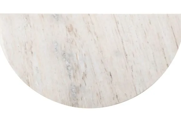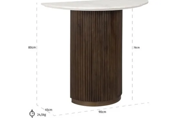 Wandtafel Mayfield 211820 van het merk Richmond Interiors is vervaardigd uit een wit marmeren blad en donkerbruine mangohouten poten. Marmer is een duurzame steensoort en heeft een luxe en stijlvolle uitstraling. De steensoort is een natuurproduct en kenmerkt zich door de unieke afwerkingen en kan zowel grove als gladde delen bevatten. Door de kenmerkende kleurschakeringen en aders is geen product hetzelfde. Zo haal je met een marmer product dus echt iets unieks in huis. Mangohout kun je herkennen aan de vele kleurschakeringen en ongelijkheden in het oppervlakte van het hout, waardoor geen enkel meubelstuk hetzelfde is. De kleuren in mangohout kunnen variëren van licht- tot donkerbruine tonen, met soms een rode gloed of juist een gelige ondertoon. Mangohout is een duurzame houtsoort. De poot heeft een geribbelde structuur in combinatie met brass (staal in mat goud) pootrand, dat zorgt voor een stoere uitstraling. De wandtafel is perfect voor kleinere ruimtes, zoals de hal.