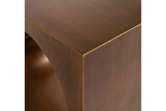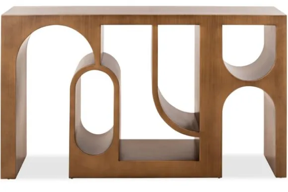 Wandtafel Lugano 213498 van het merk Richmond Interiors is een artistiek vormgegeven pronkstuk met een speels lijnenspel. De tafel is volledig uitgevoerd in geborsteld bronskleurig metaal en straalt pure elegantie uit. De uitgesneden bogen, ovalen en U-vormen creëren een fascinerend ritme van licht en schaduw, alsof het ontwerp in beweging is.